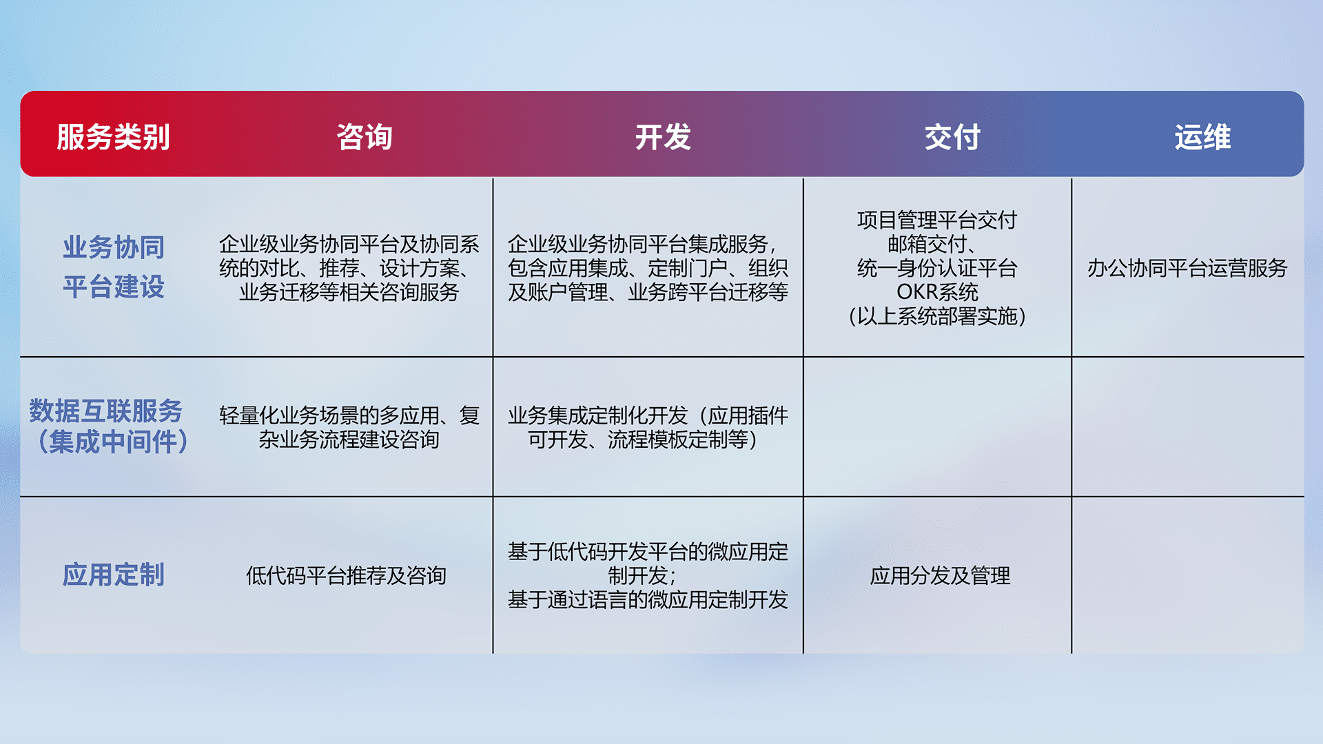 针对钉钉、、、、企微、、、、IDaas等平台级产品提供产品的规划、、、、方案、、交付、、定制化开发等服务,,实现如统一协同办公、、、智能客户服务、、、混合会议管理、、、、智能数据查询、、、等业务场景,,,,实现数字化转型。。。