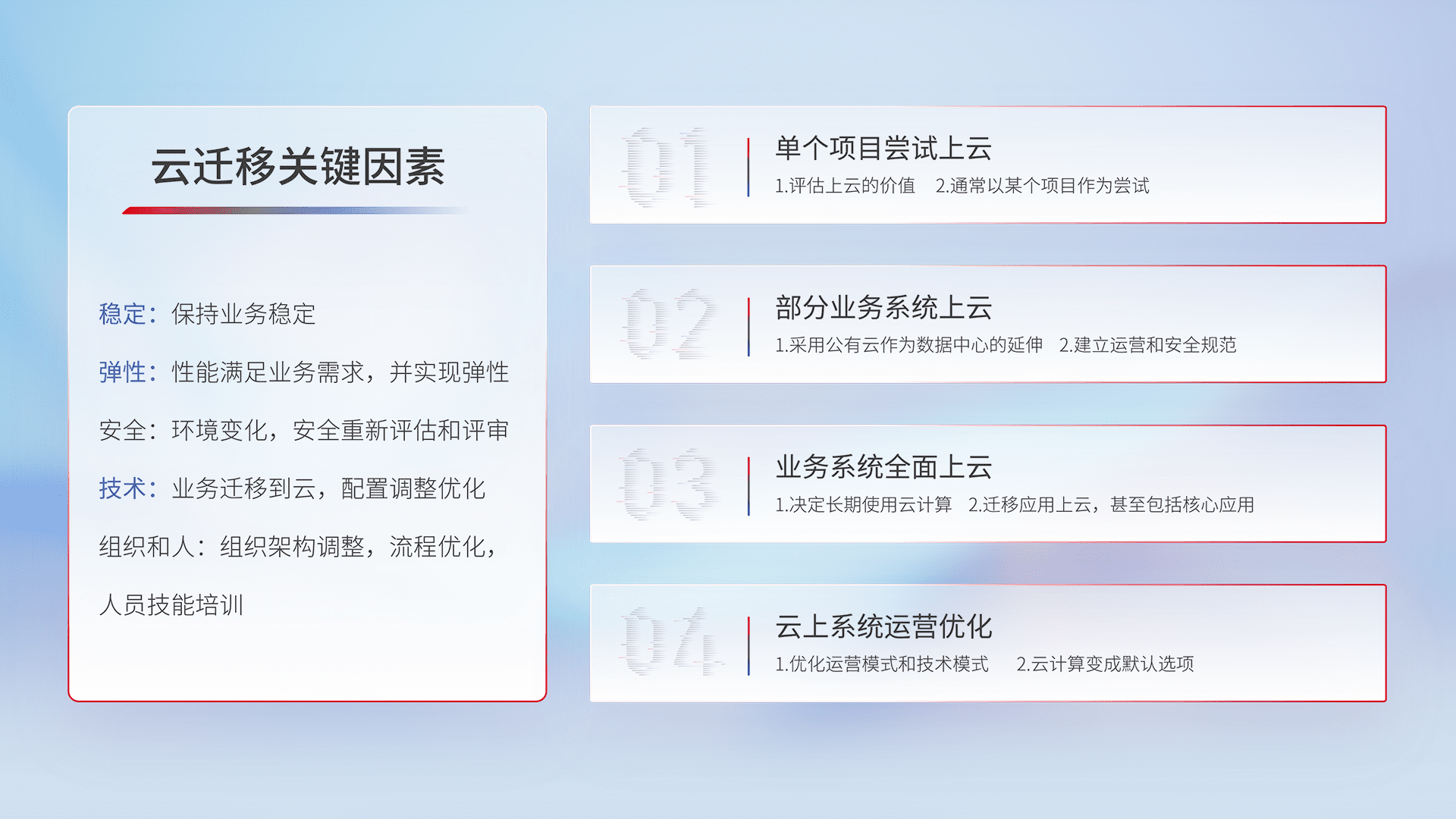 结合实际业务,,,,从规划设计、、云平台选型、、云原生改造、、、数据迁移、、、集成交付,,,,迁移全过程为客户识别最佳上云路径,,,,做好风险识别管理,,,,设计网络架构、、、身份权限、、安全审计合规、、操作审计、、、、日志审计、、、、监控告警策略、、、、多站点容灾设计等,,对云上基础设施进行整体规划,,,,提升IT治理水平,,,以满足弹性、、、、高可用、、高性能的需求。。