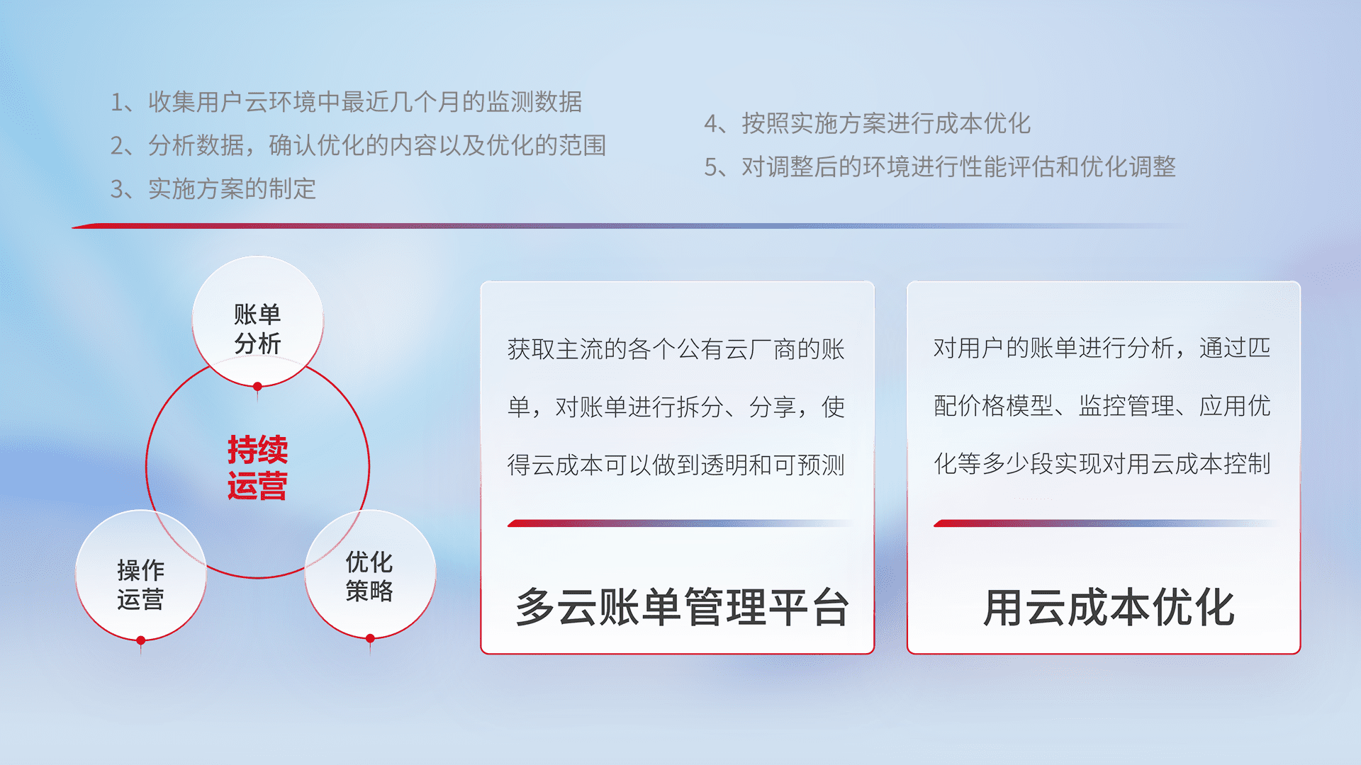 通过灵活运用多种自动化迁移工具,,,帮助企业用户实现业务和数据高效 、、、稳定的上云迁移和云上迁移,,,采用自研多云纳管平台,,,以中立管理模式,,,,解决多组织、、多云、、、、多运维厂商的复杂关系的管理,,,,保证多云平台资源配置的一致性,,,,实时掌控云资源运行数据,,运用智能化工具分析云资源多云平台的管理服务,,,透明化管理成本支出,,,,用云成本可预测、、、用云费用可优化、、、云资源配额有据可依。。