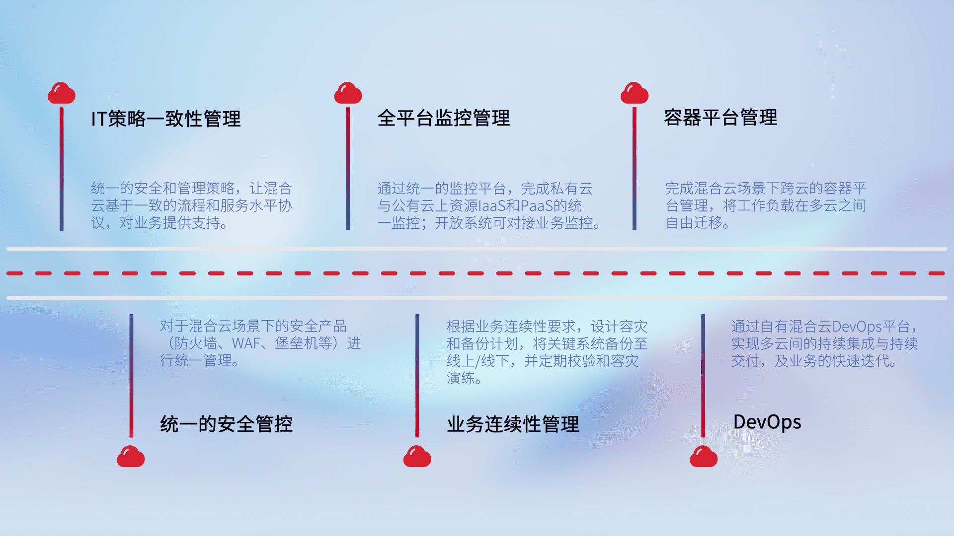 通过多云纳管,,,,以统一的资源数据模型把客户的云资源进行抽象和封装,,,,进而实现对多云资源的统一操作,,,,保障云资源管理的可靠性、、稳定性与可用性。。。。量身定制化运维内容,,,,配置、、、、开发运维、、补丁管理、、、备份、、、监控、、、、认证和访问管理、、、审计和日常巡检等,,,,保障在用云过程中的可靠度,,稳定度以及高可用率。。